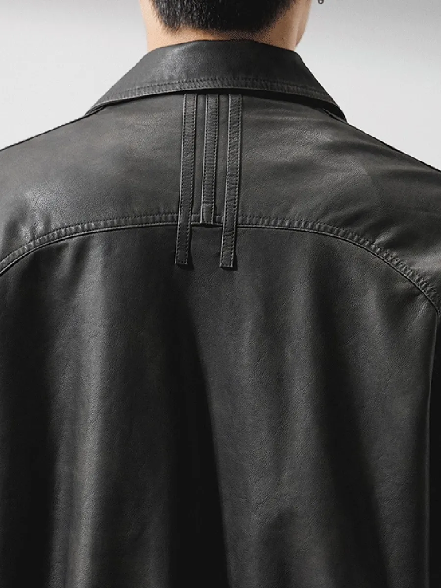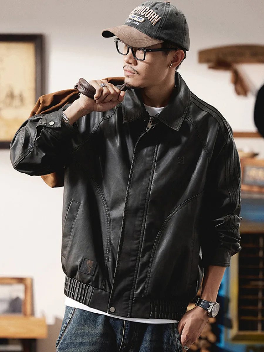 ヴィンテージ風 PUレザー 折り襟付きジャケット|背面ステッチディテール 本体素材ゴム仕様 防風ジャケット
