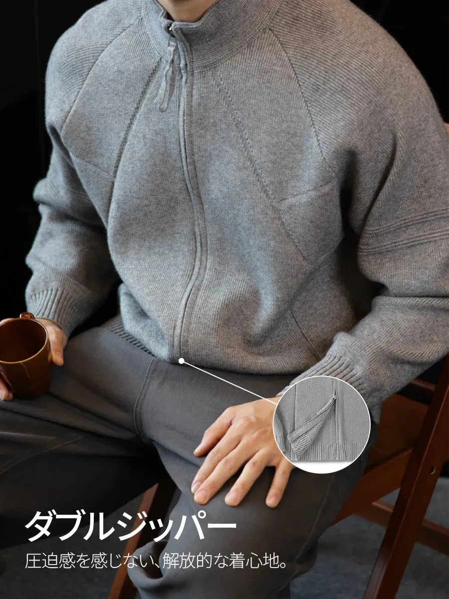 ダブルジップドライバーズニット:リブ編みのスタンドカラー、インナーにもアウターにも使える2WAY仕様、水洗い対応で3シーズン活躍
