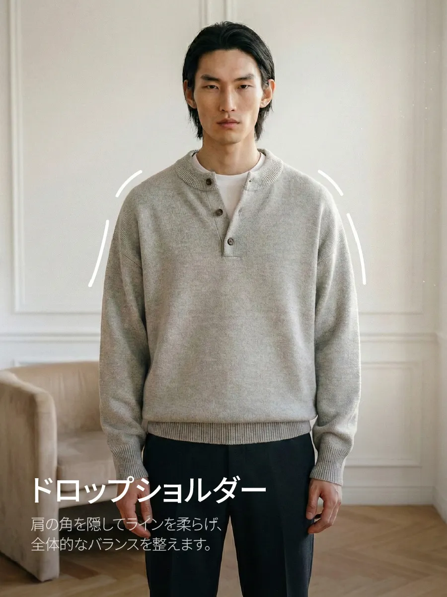 クラシックなヘンリーネックで、レトロなレイヤード感を演出