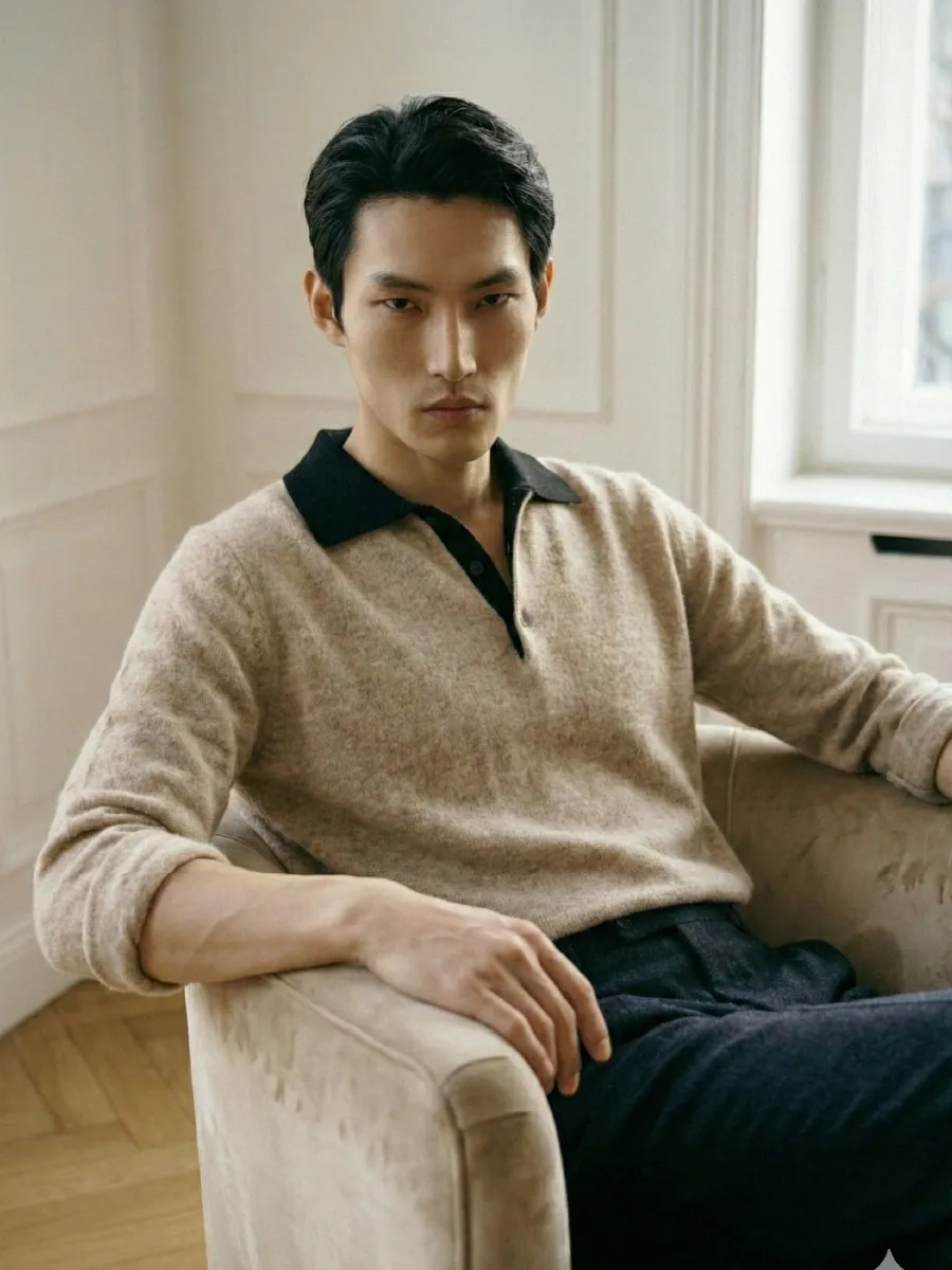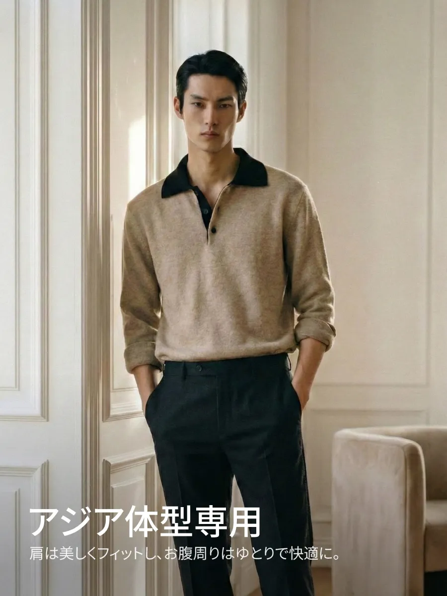 ヴィンテージのスポーツスウェットが持つクラシックなシルエットをベースに、配色の切り替え襟でアクセントをプラス。力強さの中に品の良さを感じさせるデザインが、男性らしさとエレガンスを絶妙に両立します。深みのあるブラックと杢グレーのコントラストは、アイビースタイルへの現代的なオマージュであり、ミニマルな表現の中に、大人の余裕と洗練を描き出します。