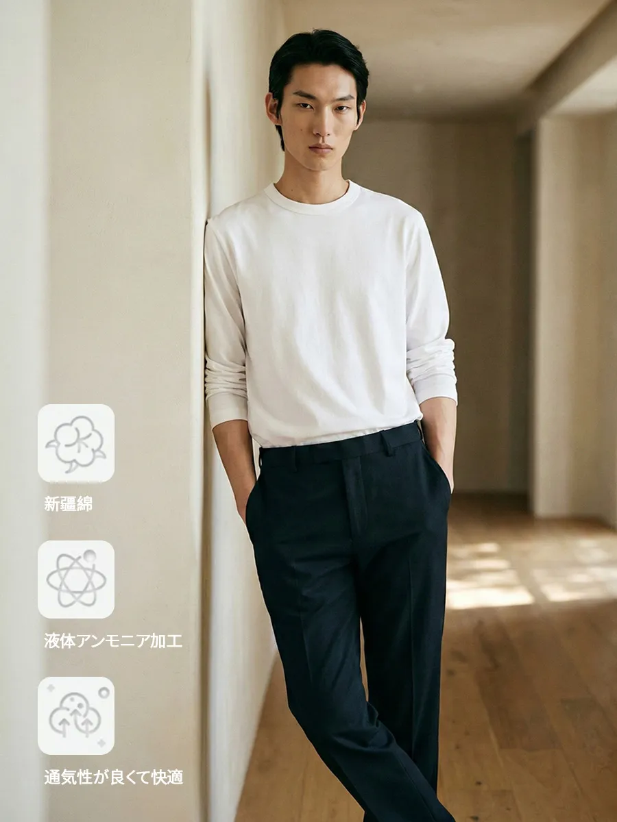 無駄を削ぎ落とした、ピュアなミニマリズムへ。クラシックな3本針ステッチを随所に施し、首元や袖口の強度を高めると同時に、繊細なステッチワークで職人のこだわりを表現しました。クラシックなクルーネックと、自然に落ちるシルエットが調和し、シンプルでありながら奥行きのある質感に。大人の男性の日常レイヤードに、上質なベースとして寄り添う一着です。