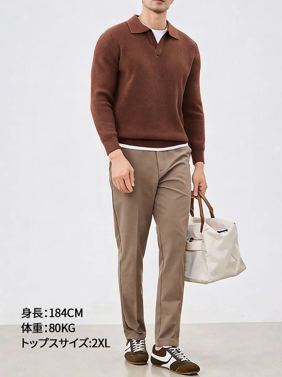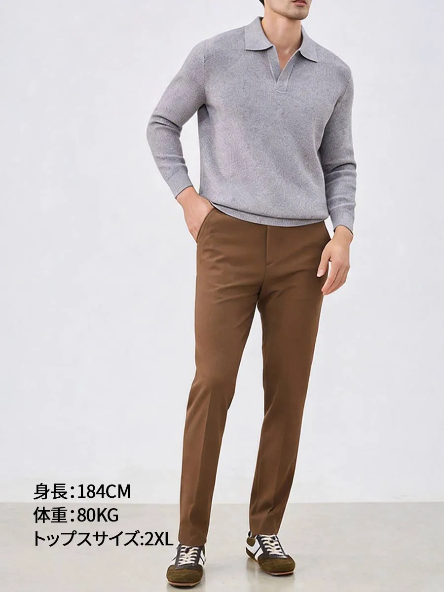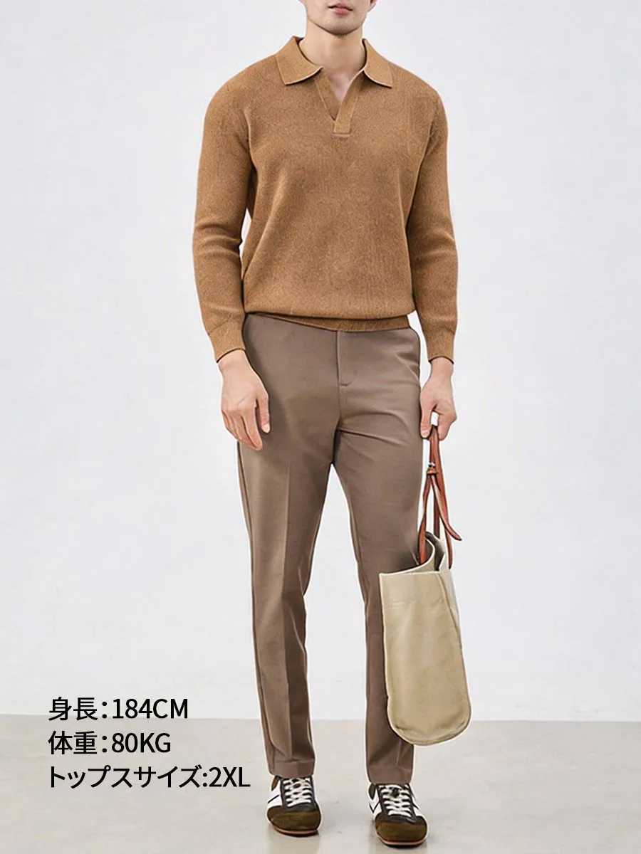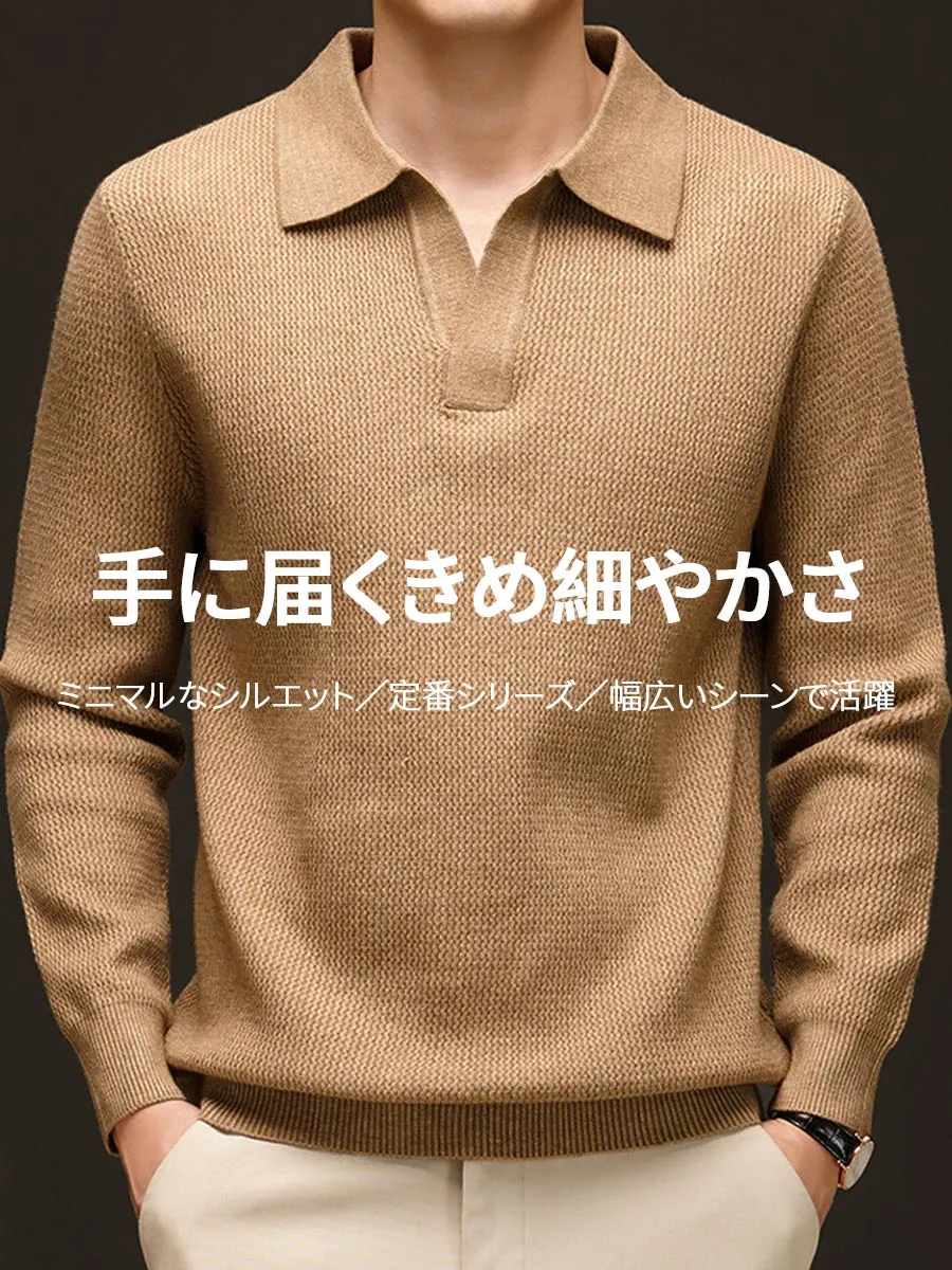 イタリアンクラシックな紳士の余裕ある美意識から着想。ボタンを省いた独自のV字型のポロネックが、さりげなく首元をすっきりと見せ、力を入れすぎない上質さを演出。立体感のある横編みデザインが、奥行きのある表情と程よいハリ感を生み出し、成熟した大人の男性が持つ落ち着きと品格を美しく表現しました。