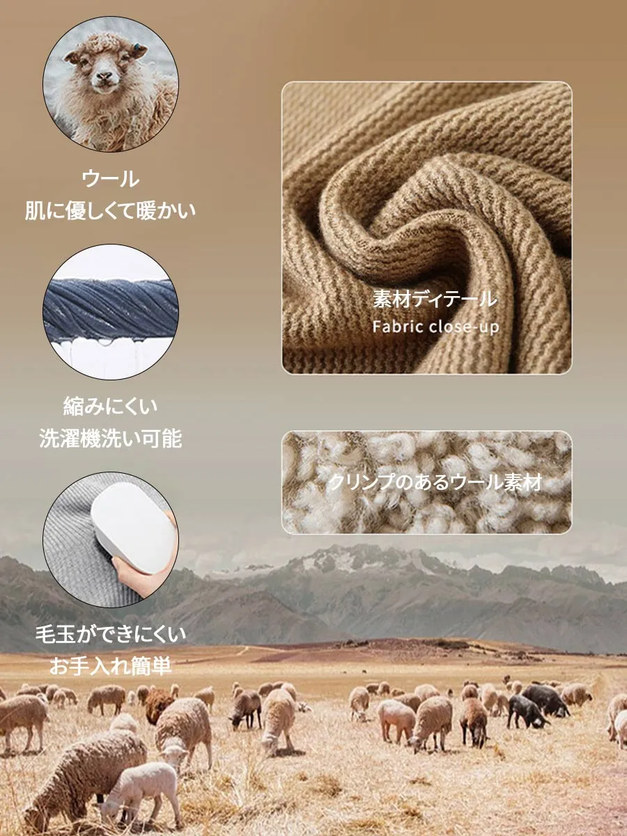 上質なウールと機能性ファイバーをバランス良くブレンド。天然ウールならではのやわらかな風合いと高級感を保ちながら、日常使いしやすいお手入れ性と毛玉を抑える実用性も兼ね備えています。暖かさと品の良さを両立した、大人のための素材です。