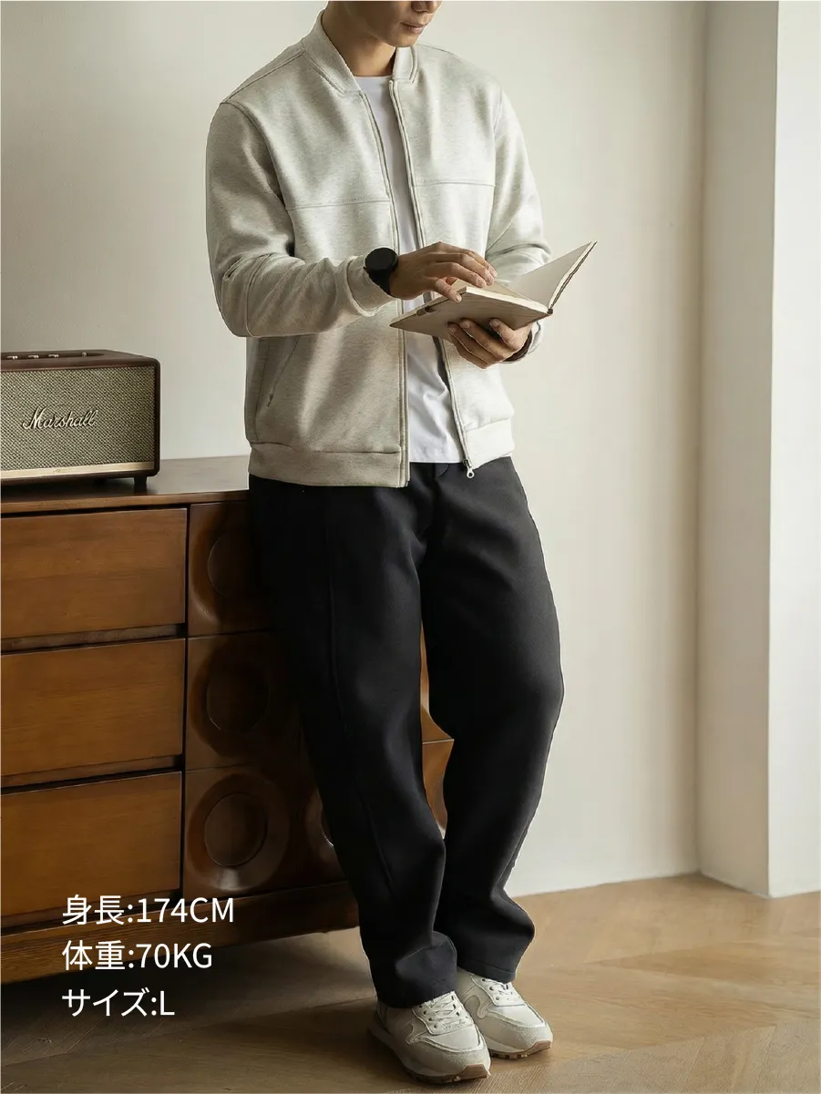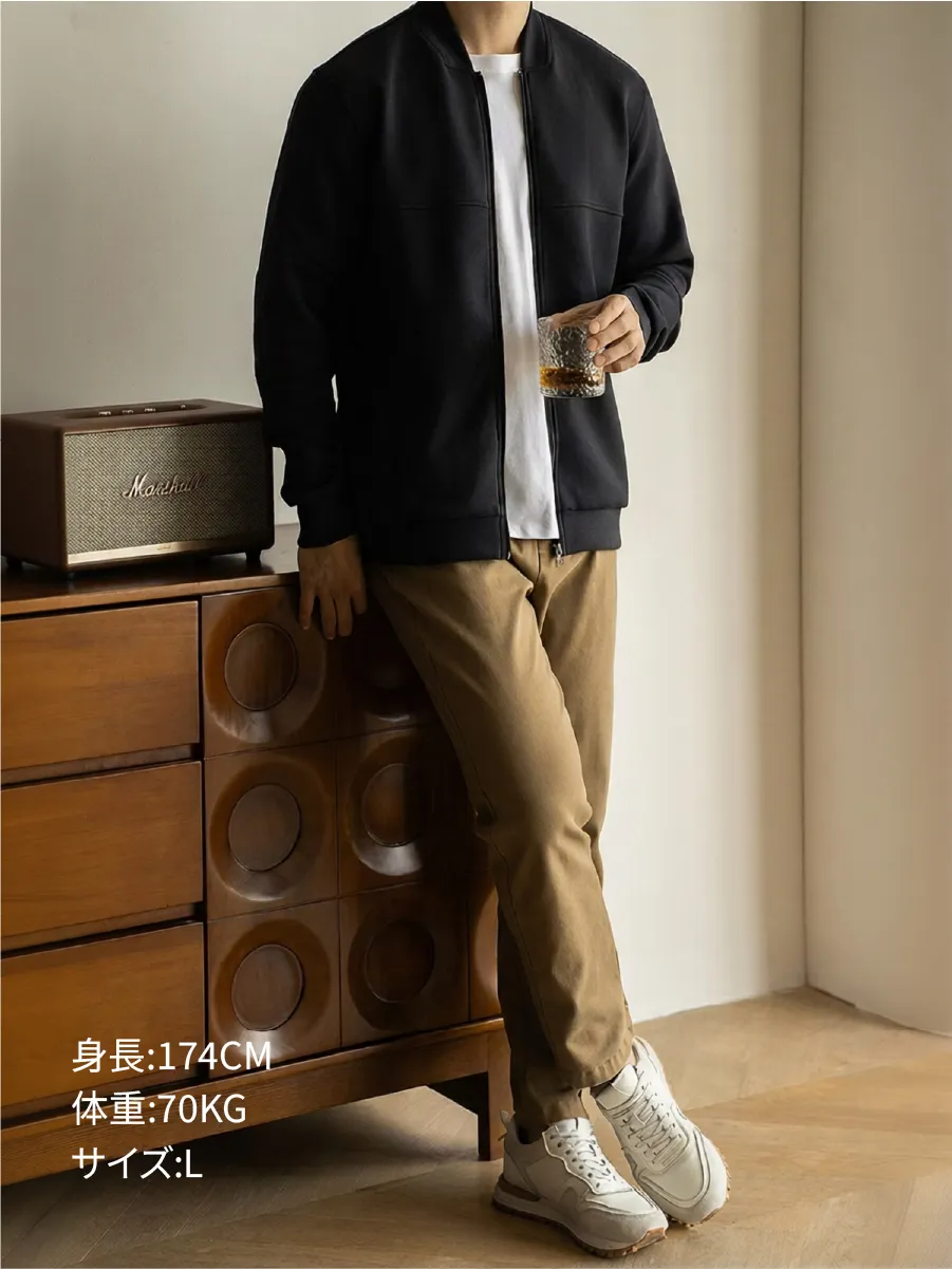 このアイテムは、クラシックなフライトジャケットのシルエットをベースに、余分なメタルパーツをあえて省くことで、落ち着いたラグジュアリー感を備えた都会的な機能美へと昇華させました。胸元の横方向の切り替えラインは、ワークウェア由来の力強い構造をさりげなく表現しながら、計算された細身のシルエットによって、まるでテーラードジャケットのようなすっきりとした印象に仕上げています。オフィスシーンから週末のリラックスした時間まで、さりげない上品さを添える一着です。