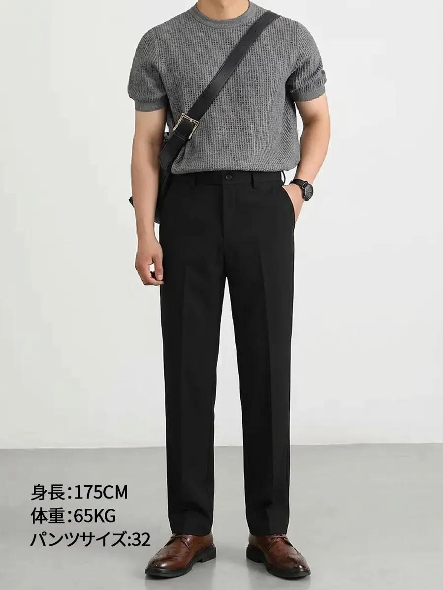 ハイストレッチノーアイロンメンズスラックス ストレートシルエット 落ち感 防シワ 通勤向けロングパンツ
