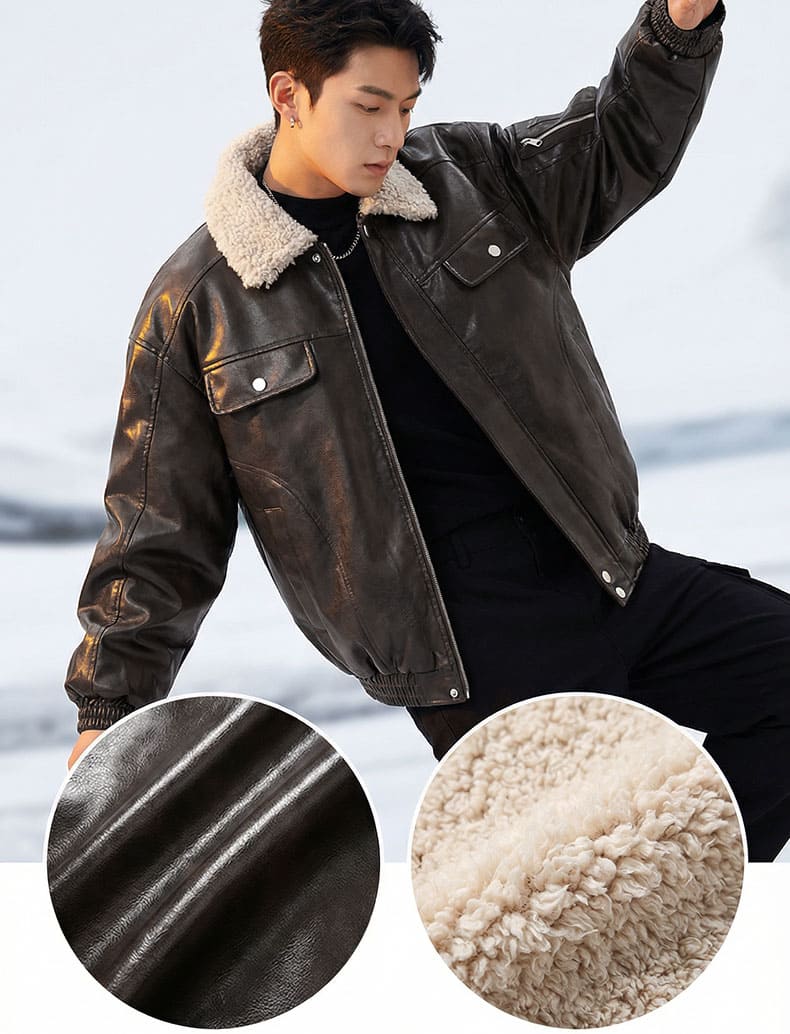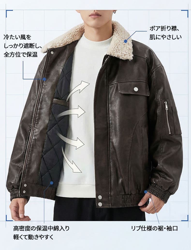 ボア折り襟 クラシックアームポケット付き中綿レザージャケット