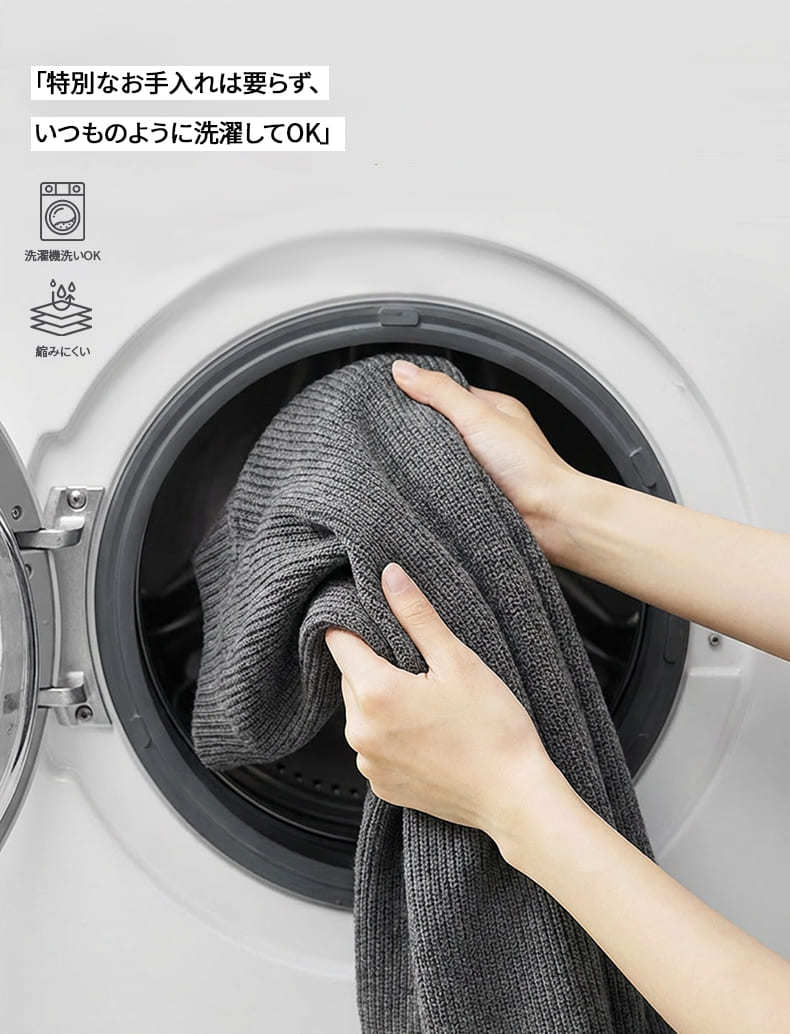 洗濯機洗いOK、縮みにくく、型崩れもしにくい